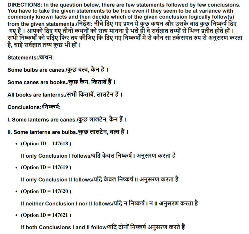 निर्देश: नीचे दिए गए प्रश्न में कुछ कथन और उसके बाद कुछ निर्देश दिए गए हैं आपको दिए गए तीनों कथनों को सत्य मानना है भले ही वे सर्वज्ञात तथ्यों से भिन्न प्रतीत होते हों सभी निष्कर्ष को पढ़िए फिर तय कीजिए कि दिए गए निष्कर्षों में से कौन सा तर्कसंगत रूप से अनुसरण करता है, चाहे सर्वज्ञानत कुछ भी हो कथन: सभी फल, शेर हैं सभी शेर, लोमड़िया है कुछ लोमड़िया, हाथी हैं निष्कर्ष:- सभी फल, लोमड़िया है कुछ फल, हाथी है